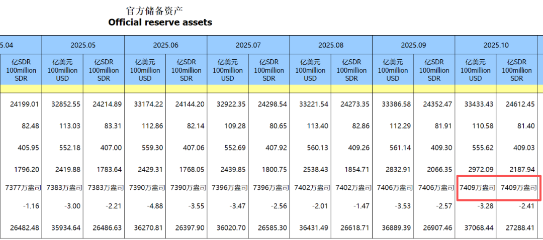 11月7日,中国人民银行发布最新数据显示,10月末黄金储备报7409万盎司(约2304.46吨),环比增加3万盎司(约0.93吨),为连续第12个月增持黄金。央行12个月共增持黄金129万盎司(约40.12吨)。
