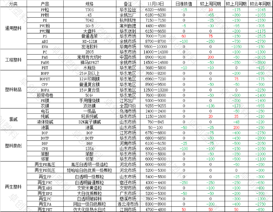 本周再生PVC市场稳中偏弱,部分地区市场成交重心窄幅下滑。截至11月13日收盘,河北白塑钢国标水洗破碎料价格为3200-3300元/吨,较上期收盘价格持平,均价3250元/吨,较上期均价持平;江苏白透明普通颗粒4300-4400元/吨,较上期收盘价格跌250元/吨,跌幅在5.43%,均价4550元/吨,较上期均低价跌50元/吨,跌幅在1.09%。