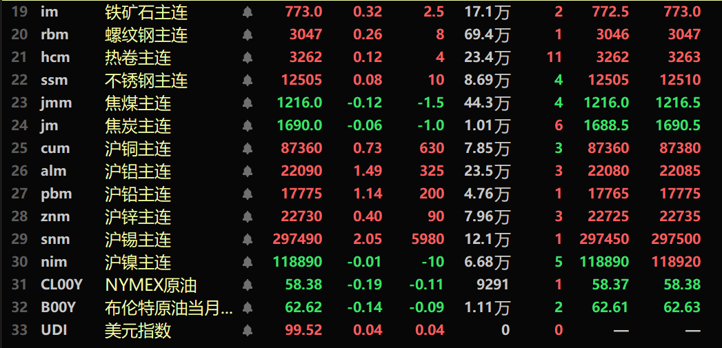 黑色系多飘红,铁矿涨0.32%,螺纹涨0.26%,热卷涨0.12%,不锈钢涨0.08%。双焦方面:焦煤主力合约跌0.12%,焦炭主力合约微跌。