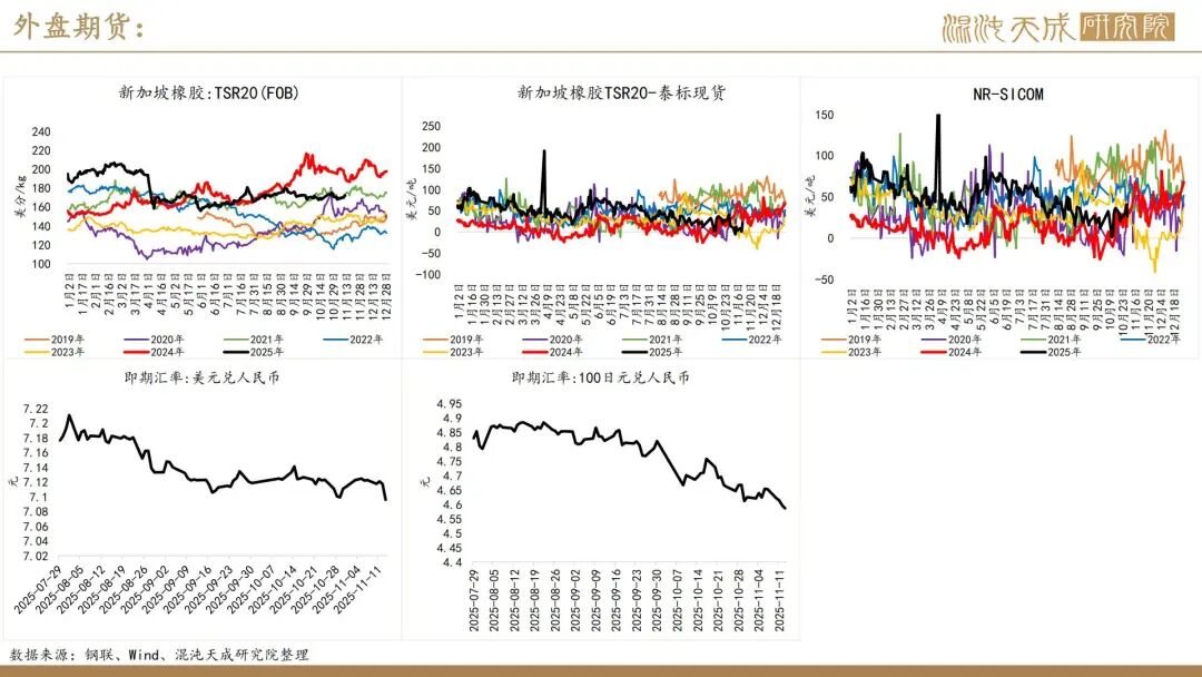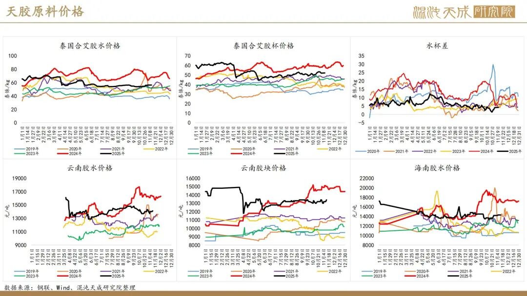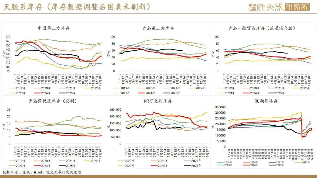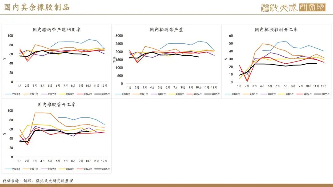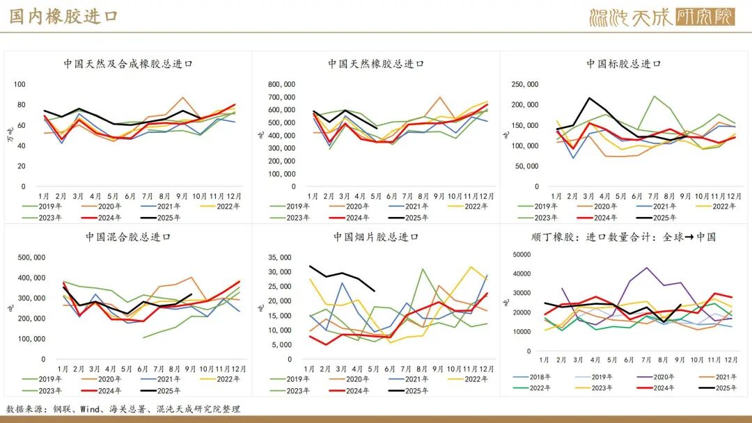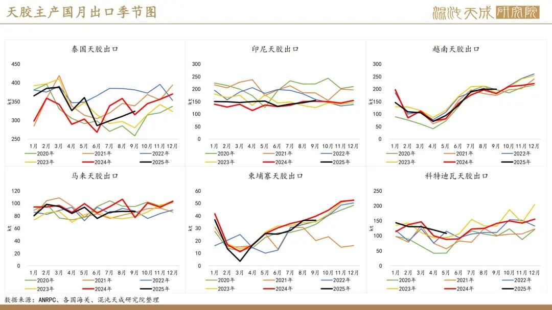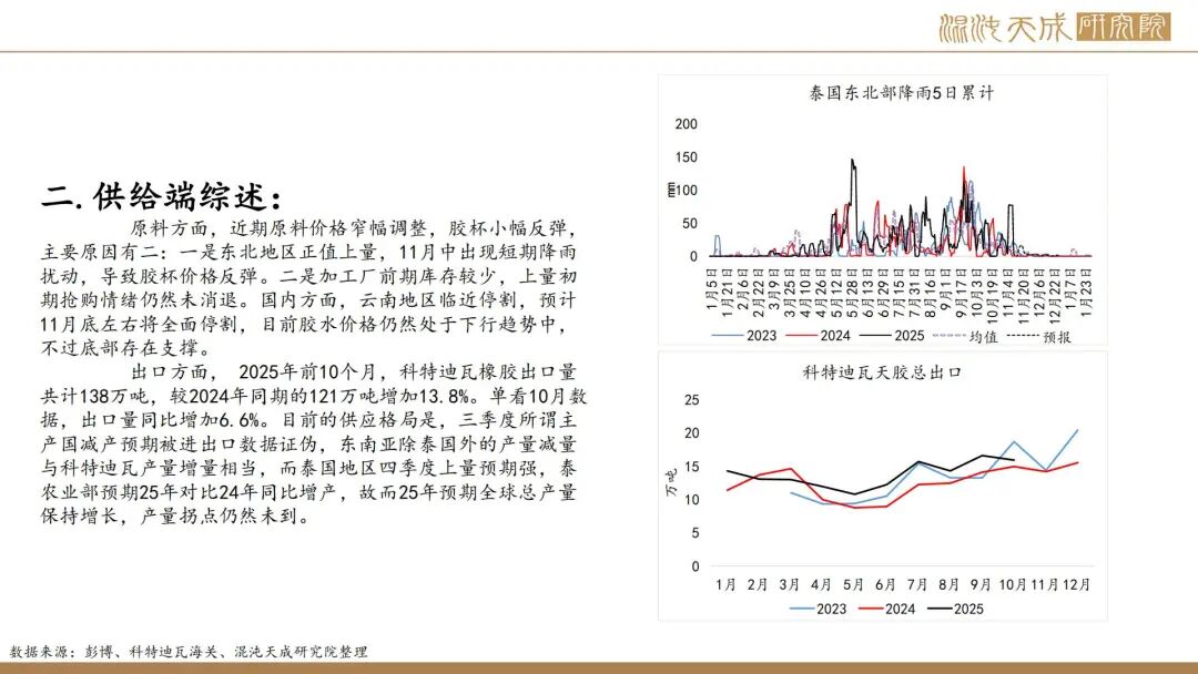 出口方面,2025年前10个月,科特迪瓦橡胶出口量共计138万吨,较2024年同期的121万吨增加13.8%。单看10月数据,出口量同比增加6.6%。目前的供应格局是,三季度所谓主产国减产预期被进出口数据证伪,东南亚除泰国外的产量减量与科特迪瓦产量增量相当,而泰国地区四季度上量预期强,泰农业部预期25年对比24年同比增产,故而25年预期全球总产量保持增长,产量拐点仍然未到。