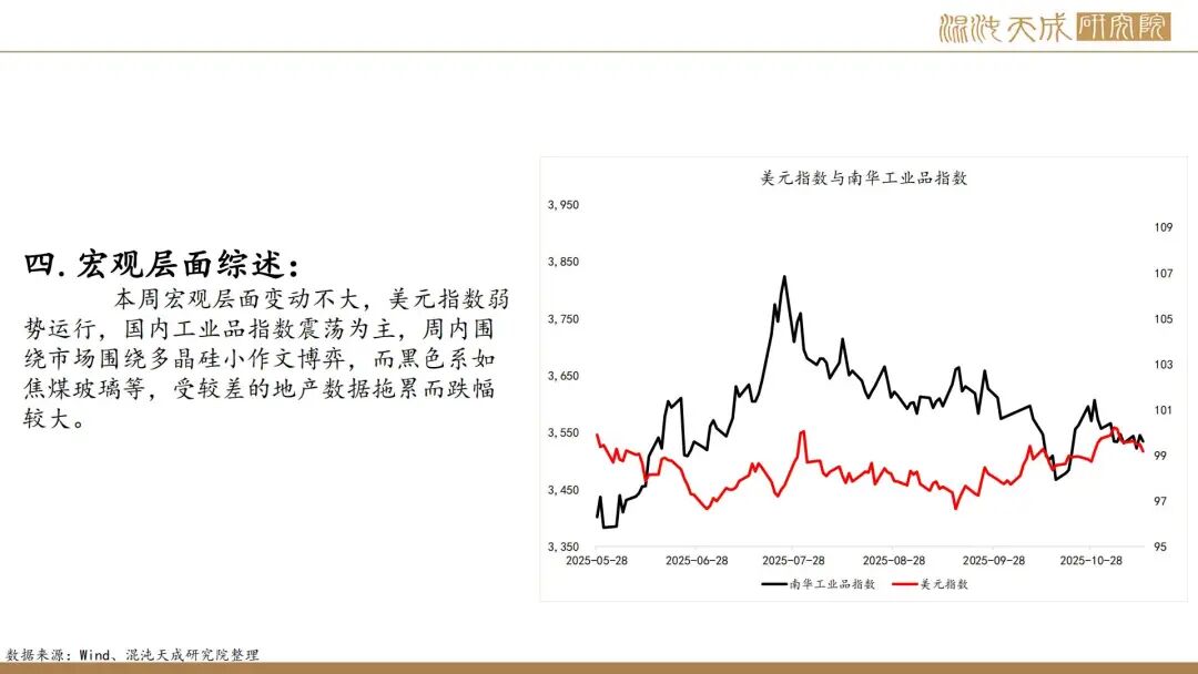 本周宏观层面变动不大,美元指数弱势运行,国内工业品指数震荡为主,周内围绕市场围绕多晶硅小作文博弈,而黑色系如焦煤玻璃等,受较差的地产数据拖累而跌幅较大。