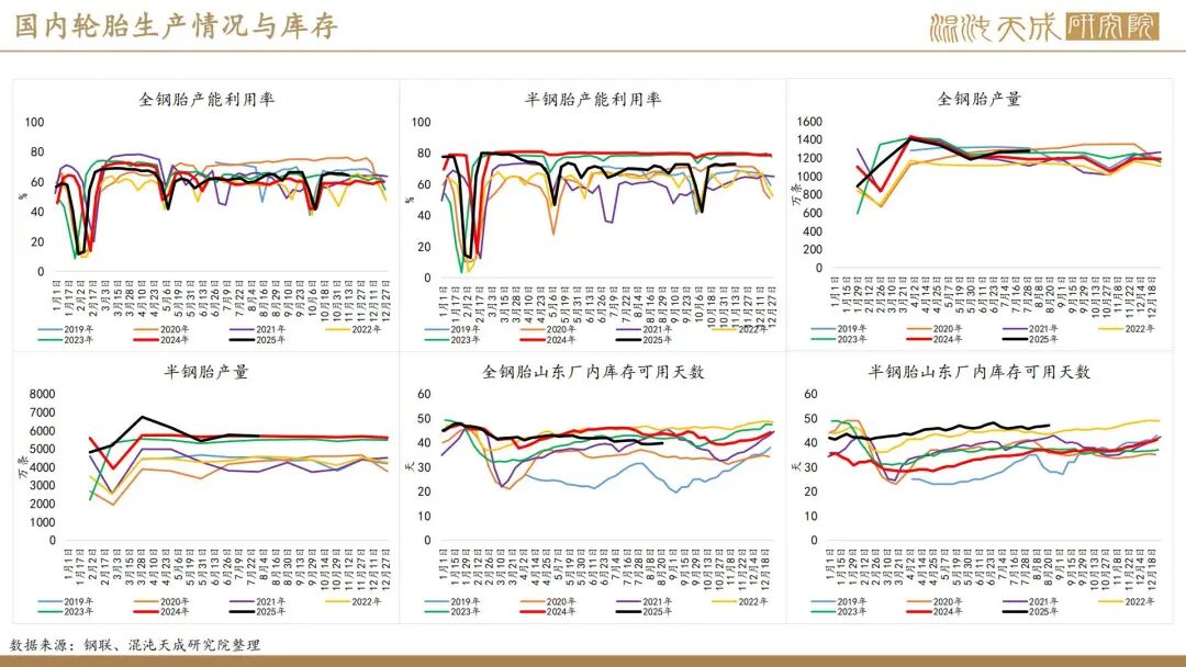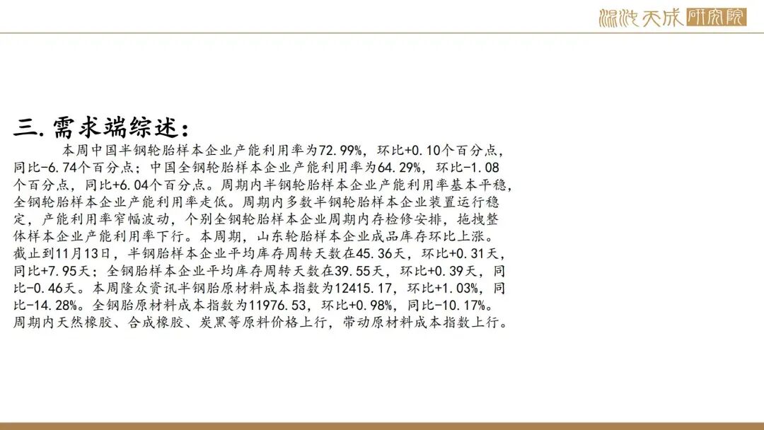 本周中国半钢轮胎样本企业产能利用率为72.99%,环比+0.10个百分点,同比-6.74个百分点;中国全钢轮胎样本企业产能利用率为64.29%,环比-1.08个百分点,同比+6.04个百分点。周期内半钢轮胎样本企业产能利用率基本平稳,全钢轮胎样本企业产能利用率走低。周期内多数半钢轮胎样本企业装置运行稳定,产能利用率窄幅波动,个别全钢轮胎样本企业周期内存检修安排,拖拽整体样本企业产能利用率下行。本周期,山东轮胎样本企业成品库存环比上涨。截止到11月13日,半钢胎样本企业平均库存周转天数在45.36天,环比+0.31天,同比+7.95天;全钢胎样本企业平均库存周转天数在39.55天,环比+0.39天,同比-0.46天。本周隆众资讯半钢胎原材料成本指数为12415.17,环比+1.03%,同比-14.28%。全钢胎原材料成本指数为11976.53,环比+0.98%,同比-10.17%。周期内天然橡胶、合成橡胶、炭黑等原料价格上行,带动原材料成本指数上行。