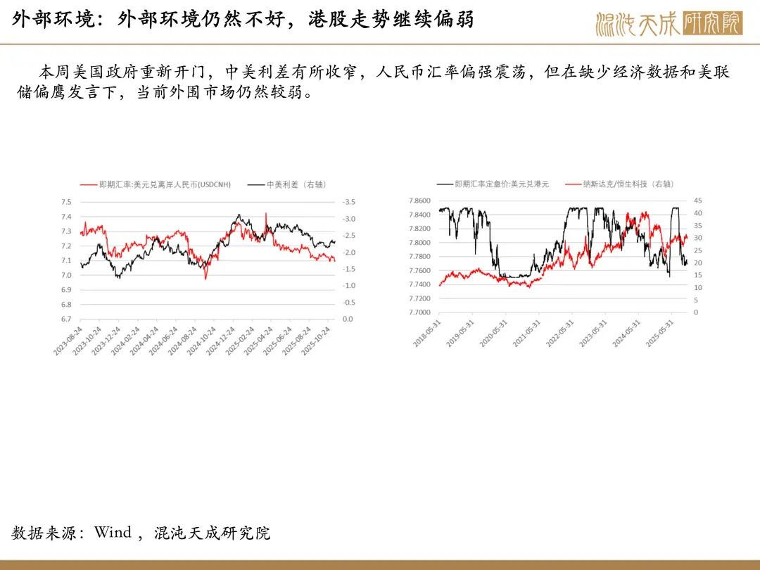 外部环境:美国政府虽然重新开门,但是美联储官员发言偏鹰,外围市场氛围并不好,但人民币汇率偏强震荡,国内市场强于外围市场。