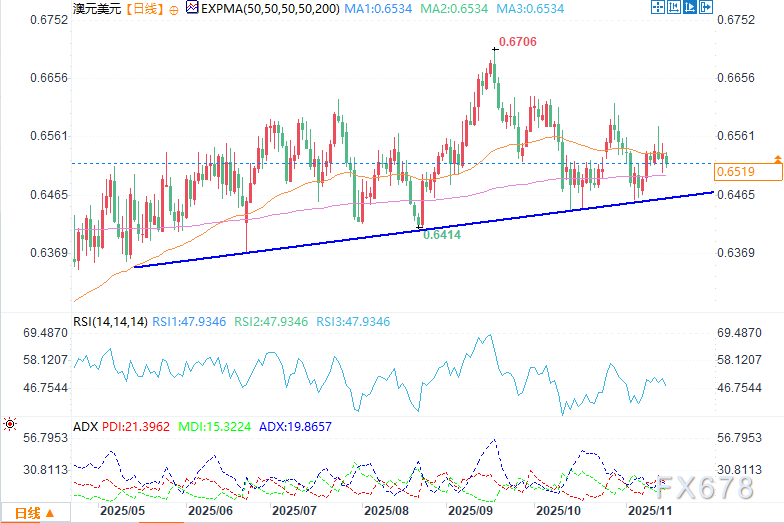 过去几周,澳元/美元汇率维持稳定,始终位于今年4月22日以来的上升趋势线上方。该货币对目前在50日指数移动平均线(EMA)附近盘整,相对强弱指数(RSI)处于中性水平,平均方向指数(ADX)走低,表明市场动能有所减弱。