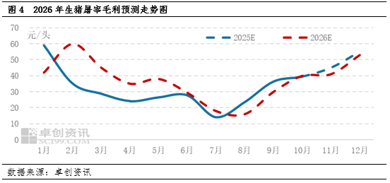 2026年春节处于2月中旬,终端需求旺盛,此阶段宰厂大量备货,毛利月均值或达到全年峰值。春节后,消费淡季来临,宰厂减量或明显,但预计该时段毛猪采购成本低位,宰厂不乏有分割入库动作,宰量降幅或较往年收窄,毛利降幅或较往年偏小,整体或维持在40.00元/头上下。5-8月需求淡季期间,猪肉走货或缓慢,屠宰量或下滑至低位,毛利或亦降至低谷,预计7月毛利降至年内低点。及至四季度,传统节日备货叠加腌腊提振宰量增加,屠宰毛利均值或升至高位,预计均值达53.00元/头。