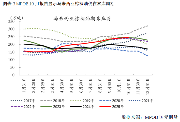 根据2025年11月10日MPOB发布的10月供需报告,马棕产量达204.4万吨,环比增长11.02%,显著高于市场预期;出口169.3万吨,环比大增18.58%,主要受中国集中采购提振;期末库存升至246.4万吨,环比增4.44%,库存绝对水平仍处高位。进入11月,高频数据显现季节性拐点特征,两家船运调查机构数据显示11月1-10日棕榈油出口量环比大幅下降9.5%和12.3%。此外,持续降雨可能导致河流沿岸及低洼地区发生洪涝,市场预计从11月开始产量将逐渐放缓。11月起产地步入减产周期,供应端收缩预期增强,然而出口同步走弱削弱去库动能。