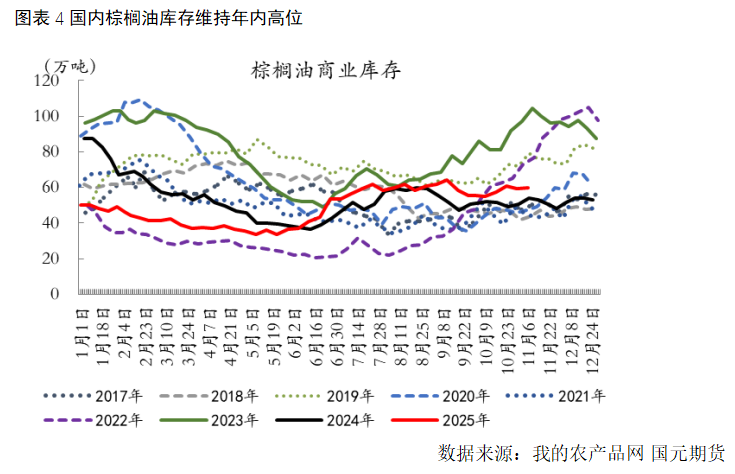 2025年10月,国内棕榈油市场呈现进口阶段性回升、库存压力累积、需求淡季特征显著的格局,供需双弱态势下价格承压运行。高企的进口成本抑制贸易商采购意愿,部分订单被迫推迟或取消。随着气温下降,棕榈油在食品加工领域的需求(如油炸食品、烘焙用油)减少,沿海地区提货量环比下降。期货价格下跌引发终端企业逢低补库,不过,这种采购属于被动补货,难以持续提振需求。据Mysteel调研显示, 截至2025年11月7日(第45周),全国重点地区棕榈油商业库存59.73万吨,环比上周增加0.45万吨,增幅0.76%;同比去年53.88万吨增加5.85万吨,增幅10.86%。