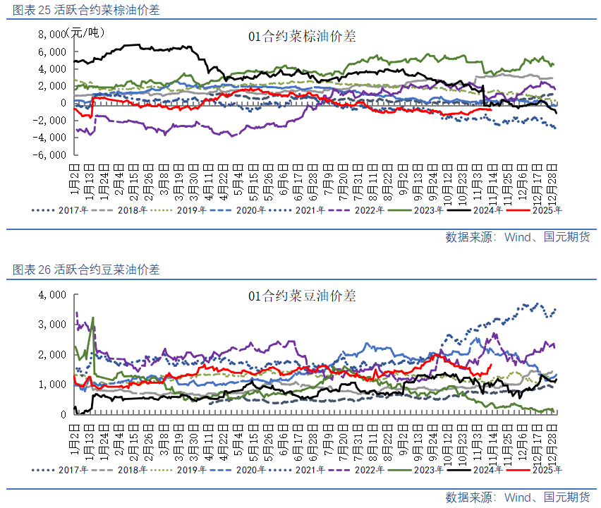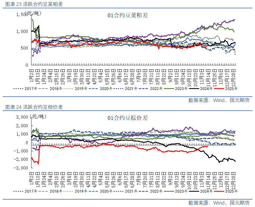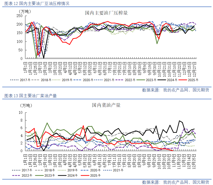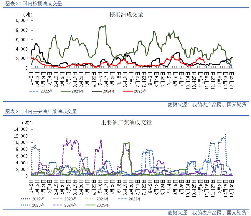 【菜油】最近1-2周沿海油厂菜籽库存及压榨量几乎归零,短期供给端存在有限缺口,菜油库存持续去化,对价格形成较强支撑,澳菜籽预计最快月底达到广州港,但从已知的采购量来看,每月预计2-3船,不及20万吨,无法扭转菜籽油供应趋紧的局面,主要缓解菜油降库存速度。不过,国内贸易商已开始逐步补充一季度进口菜油,菜油相对豆油性比偏低,需求仍维持刚需为主。