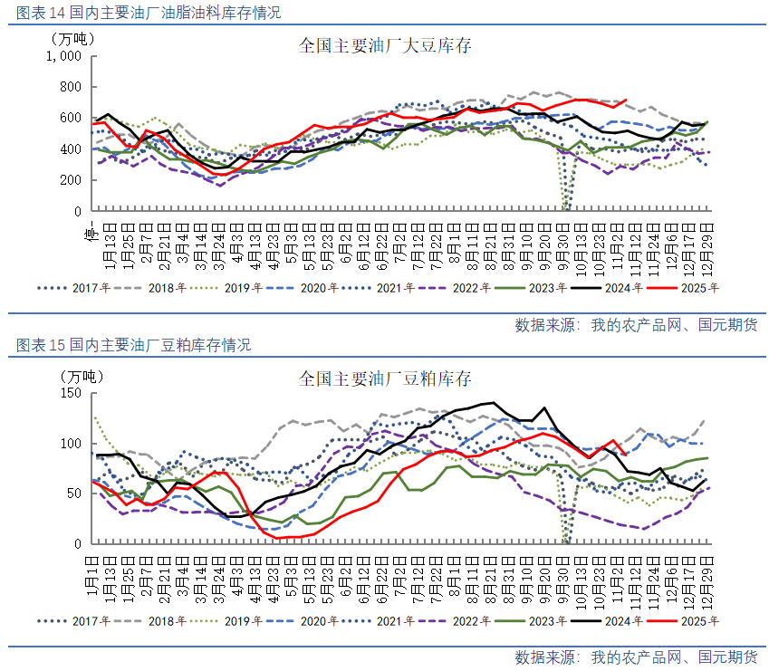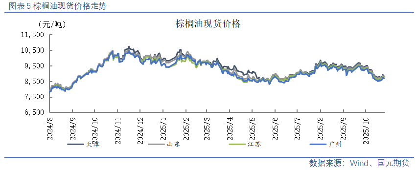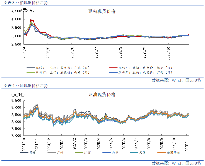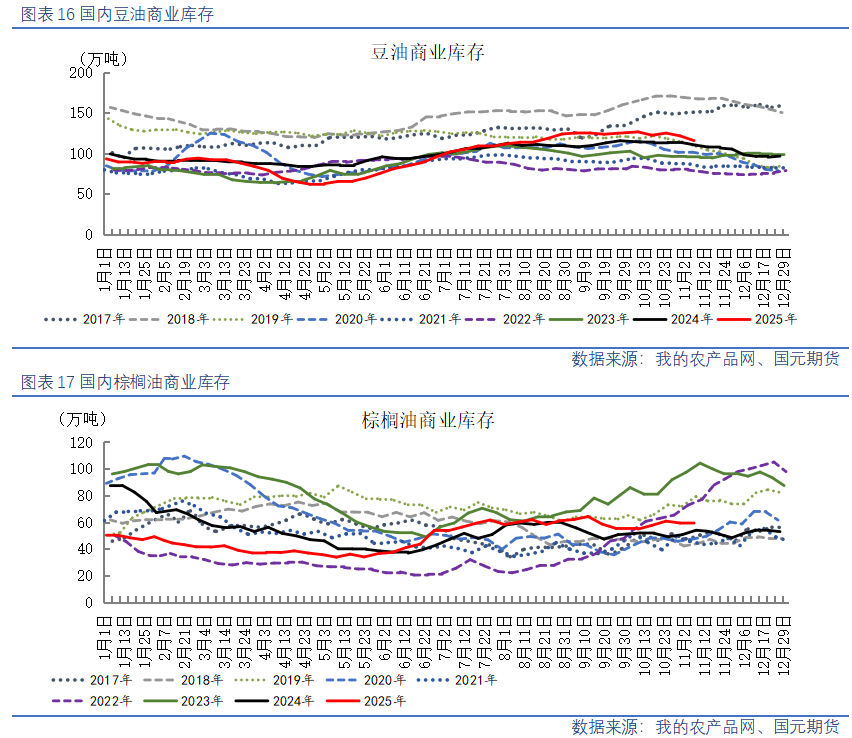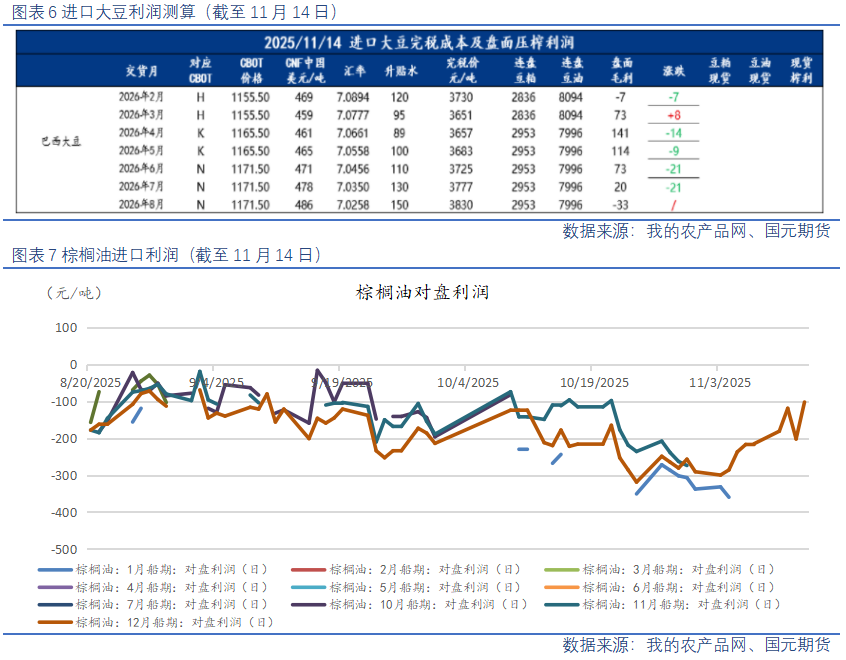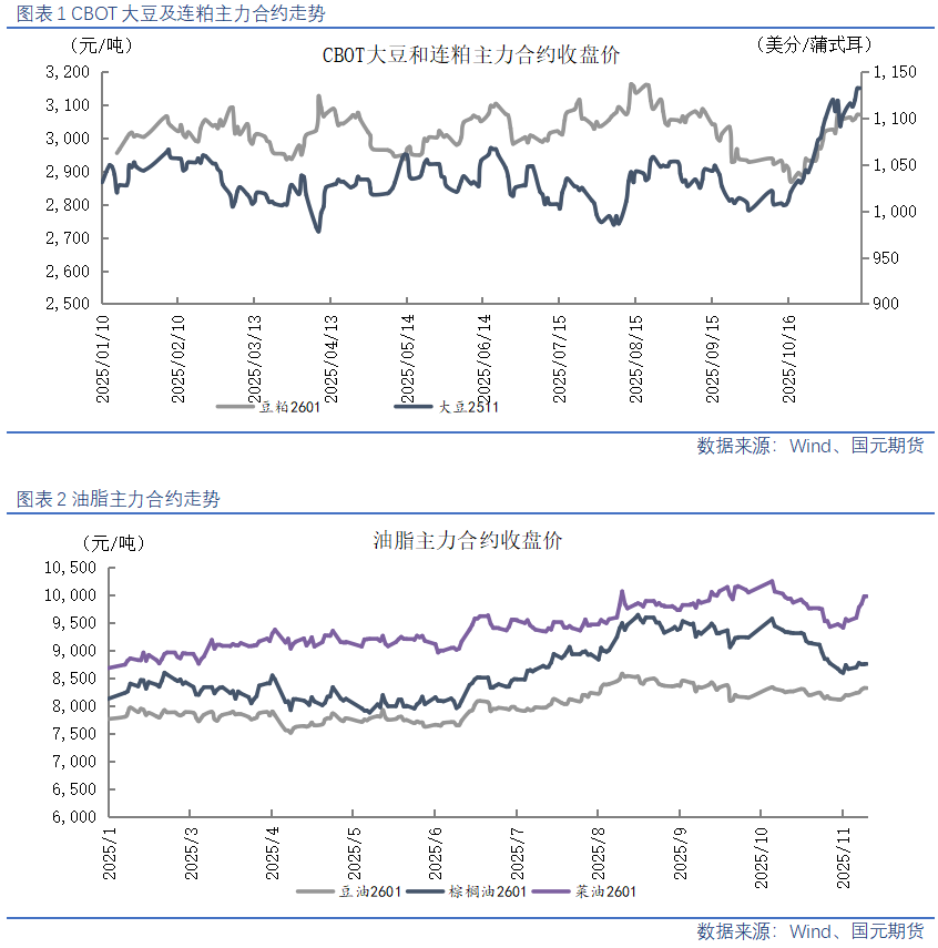 【棕榈油】10月马来西亚棕榈油产量如期大幅增加且库存压力较大,但价格高位下跌吸引买家逢低购入,10月马棕出口数据意外强劲,给予盘面上涨支撑。产地棕榈油通常从11月开始进入减产周期,不过目前来看,增产季时间窗口在逐步收窄,需关注后续出口需求表现,ITS和AmSpec高频数据显示,11月1-10日棕榈油产品出口量较上月同期减少12.3%和9.5%。国内豆棕价差继续修复,棕榈油性价比逐渐提升,11月有部分到港带动商业库存反弹,关注12月买船情况。