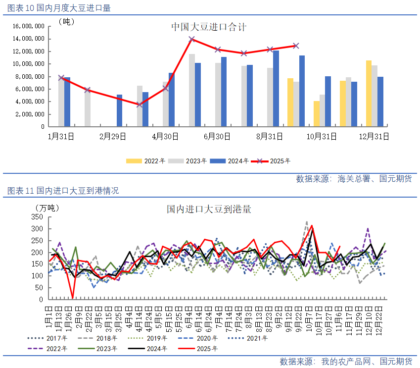 【中国2025年10月大豆进口948.2万吨】据海关总署数据显示:中国2025年10月大豆进口948.2万吨,环比9月进口减少338.7万吨,较2024年10月进口量同比增加139.5万吨,增幅为17.25%。2025年1-10月中国累计进口大豆总量为9568.2万吨,同比增574.5万吨,增幅为6.39%。
