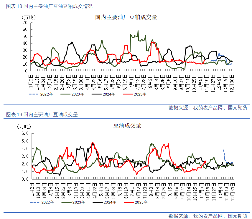 【美国农业部恢复发布周度出口销售报告】美国农业部自政府10月1日停摆以来首次恢复发布周度出口销售报告。数据显示,截至9月25日当周,2025/26年度美国大豆净销售量87.05万吨,主要买家包括荷兰、埃及、日本等国。美国农业部表示将在未来10周内逐步发布之前推迟的出口销售报告。