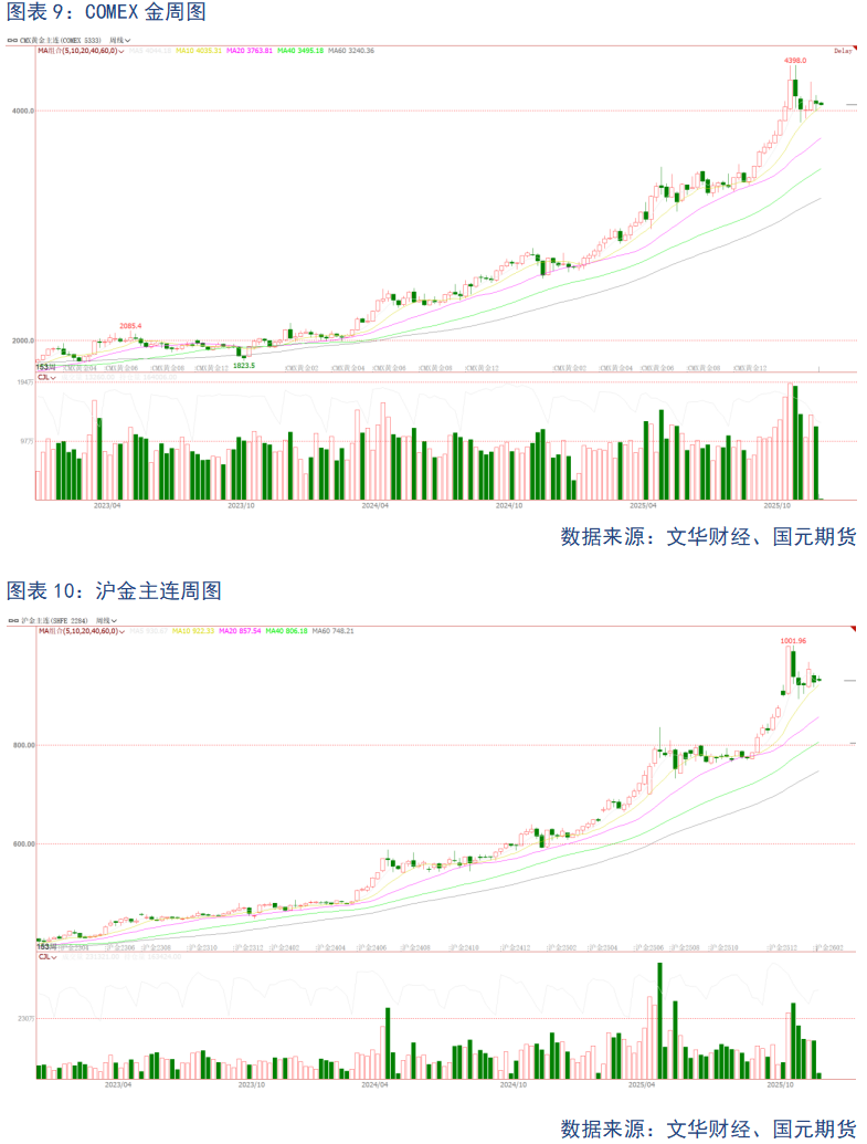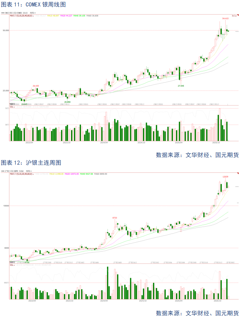 从技术分析来看,黄金和白银均呈现长期多头趋势。黄金方面,COMEX 黄金与沪金周线的均线系统呈典型多头排列,价格持续运行于各均线上方,虽近期有回调但未破坏上升趋势结构;白银方面,COMEX 白银和沪银周线同样展现出均线多头排列特征,价格沿均线系统持续走高,期间调整属于上升趋势中的正常回调。综合而言,黄金和白银的上涨趋势均具备较强延续性,后续大概率继续维持上升走势。