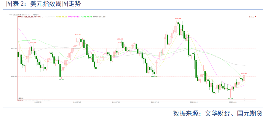 结合近期美国宏观消息面,美元指数周线级别走势预计将延续震荡偏弱格局。美联储理事沃勒支持12月降息的表态以及副主席杰斐逊对就业下行风险的关注,均释放出货币政策可能转向宽松的信号,而9月非农数据中失业率意外升至4.4%以及ADP就业连续四周负增长,进一步强化了劳动力市场放缓的预期。尽管新增就业人数超预期,但失业率上升、薪资增长放缓等矛盾数据,仍使市场倾向于认为经济动能在减弱。此外,10月非农报告取消、11月数据延迟至12月美联储议息会议后发布,意味着决策者在12月会议前缺乏完整的就业数据参考,这可能加剧美联储内部对政策路径的分歧,进一步抑制市场对加息的预期。在此背景下,美元指数短期内难以获得强劲支撑,中长期若通胀持续温和、就业市场进一步疲软,不排除美元面临更明显的下行压力。