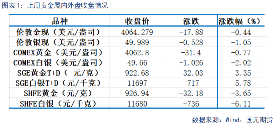 本周贵金属市场相对持稳,外盘伦敦金银分别下跌0.44%和1.05%,COMEX金银跌0.77%和2.02%;内盘SGE金银T+D分别跌3.35%和5.78%,SHFE金银跌3.65%和6.11%,市场整体看空情绪较浓。