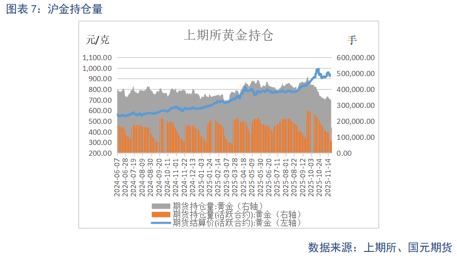 截至11月21日当周,沪金主力期货持仓量为160310手,较上周增加46713手;沪银主力期货持仓量为346638手,较上周增加136312手。