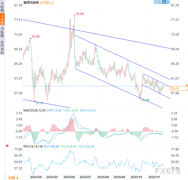 汇通财经APP讯——随着冬季需求临近,OPEC维持2026年第一季度产量限制,在降息预期推动的广泛市场情绪影响下,原油价格成功稳于59美元/桶关口上方。当前关键价位将决定这波反弹行情的可持续性。周一(12月1日)美原油涨幅约1.23%,交投于59.25美元/桶附近。