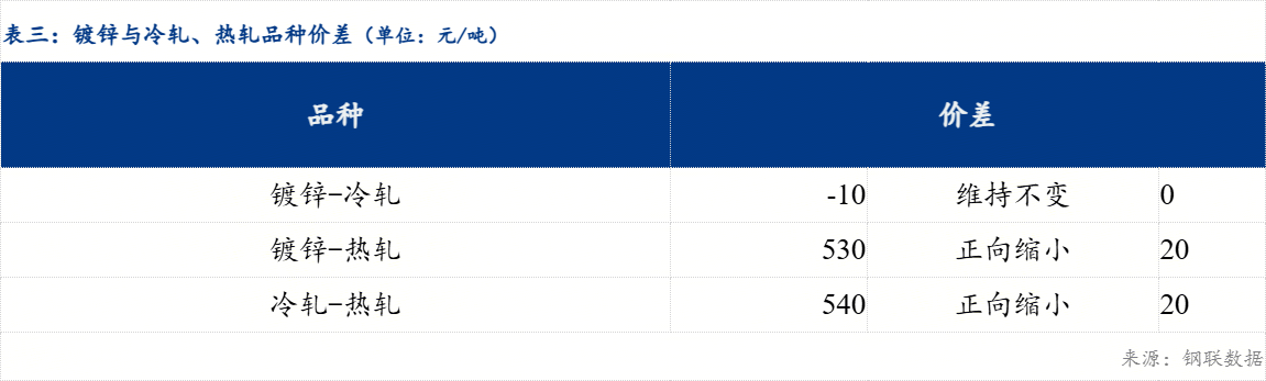 重庆、上海地区冷轧板卷区域价差反向扩大10元/吨;重庆、广州冷轧板卷区域价差正向缩小10元/吨。重庆、上海镀锌板卷区域价差维持不变0元/吨;重庆、广州镀锌板卷区域价差正向缩小10元/吨。镀锌、冷轧品种价差维持不变0元/吨;镀锌、热轧品种价差正向缩小20元/吨;冷轧、热轧品种价差正向缩小20元/吨。