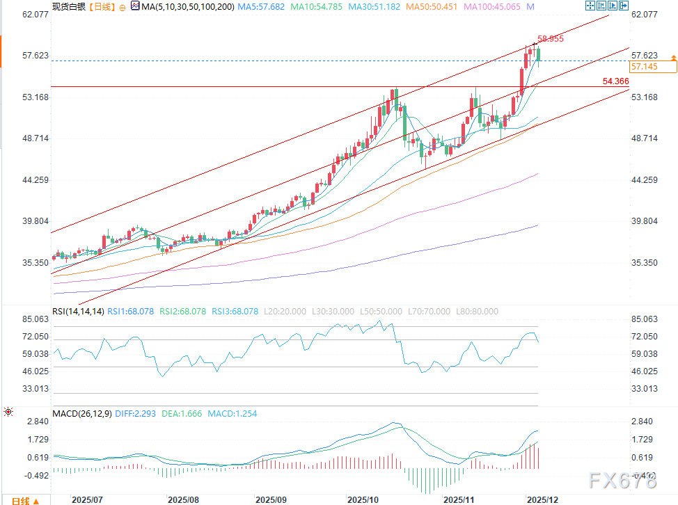 汇通财经APP讯——周四(12月4日)欧盘时段,现货白银大幅下挫,在触及58.96美元历史高点仅一日后回落近3%。此次下跌反映出近期涨势后市场出现激进获利了结,给短期价格带来下行压力。市场参与者指出,回调后银价可能测试50%分位的53.81美元,而50日均线50.45美元仍是主要趋势指标。