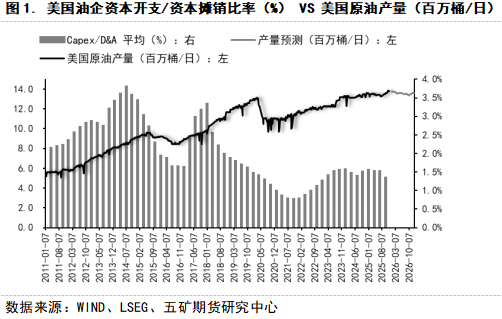 从美国页岩油企业投资的角度来看,美国大幅增产已无可能,我们用资本支出与资本摊销比率(CAPEX/D&A,%)表达企业资本扩张的速度和意愿。当前CAPEX/D&A已接近1%,表明企业更注重于资产效率的维持或优化,而非勘探扩张。