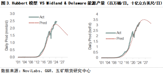 从传统能源产量模型Hubbert模型的预测来看,我们认为如若钻井活动维持低迷或采油科技无飞跃式的提升(即开采效率无质变),美国原油产量将在2026年见顶甚至小幅下滑,于2027年出现规模性衰竭,需要注意的是此模型对于天然气的定量准确性略优于原油。