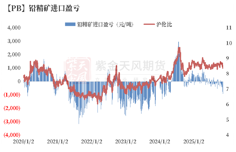 整体上,短期铅炼厂仍以追求副产品综合效益为主,仍有意向含银及小金属的铅精矿支付更低的加工费,部分26年长单TC已跌至-160~-200美元/干吨。
