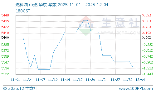 据生意社商品分析系统显示,11月份国内华东地区船燃市场行情震荡下行。截至12月4日国内燃料油180CST均价为5337.50元/吨,较11月1日的5400.00元/吨,下跌1.16%。