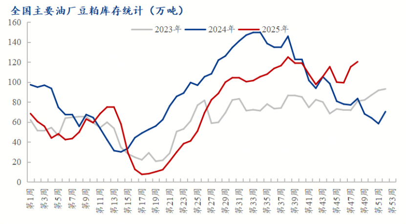 自11月底以来,市场频传“油厂断豆停机”“储备大豆拍卖”等消息,看似平静的现货市场实则暗流涌动。当前核心矛盾,仍集中于现货端的累库压力与远期大豆榨利深度亏损之间的拉锯。据Mysteel数据,国内豆粕库存仍处累库阶段。截至11月28日,油厂豆粕库存已升至120.32万吨,周度增加4.49%,同比增幅更达44.18%。现货供应整体宽松,构成市场显性压力。与此同时,远期进口大豆盘面榨利持续深度亏损,成为当前价格最重要的心理与定价支撑。以12月4日成本测算,2026年3月前到港的巴西及美豆均无商业榨利,这显著抑制了远期买船积极性,从成本端封堵豆粕下行空间。豆粕库存能否去化,关键取决于后续到港。据Mysteel预估,12月大豆到港量仍达904.8万吨,而2026年1-2月将明显下降至600万、400万吨。尽管到港缩减,但考虑到高结转库存及1-2月需求季节性低迷,供应实质性收紧的窗口可能延后至2026年3-4月。此外,国储大豆投放的潜在可能性,也为远期供应预期增添了一层不确定性。