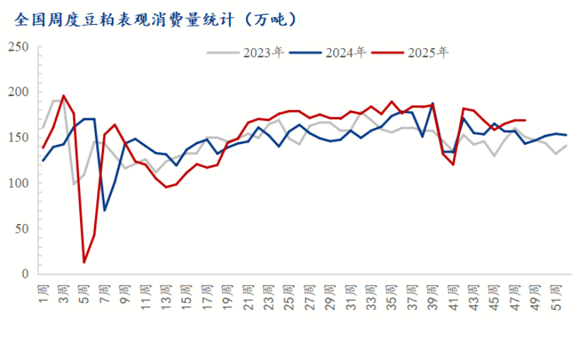 二、需求端的模糊承接当前国内养殖存栏总体平稳,豆粕消费更多随备货节奏、添加比例及物理库存而波动。据Mysteel数据,11月28日当周豆粕表观消费量为168.69万吨,较前一周增加0.13万吨,增幅0.08%,同比去年增加26.01万吨,增幅18.2%。近期豆粕表观消费量维持平稳,油厂多依出货情况被动调节压榨节奏,使得需求面对价格既形成托底,又缺乏强势拉动。