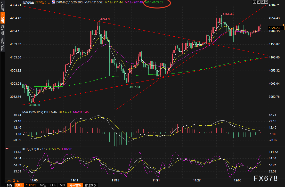 从技术形态来看,4245-4250美元区域已成为当前最关键的多空分水岭。只有有效站稳并收盘于该区域上方,才足以确认多头重新掌控局面,进而打开向4277-4278美元、甚至4300美元整数关口的上涨空间。一旦突破4300美元,将被视为重要的趋势性信号,多头有望迎来一轮可观的短期涨幅。