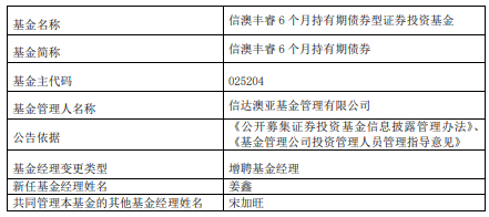 中国经济网北京12月5日讯 今日,信达澳亚基金公告,信澳丰睿6个月持有期债券增聘姜鑫。