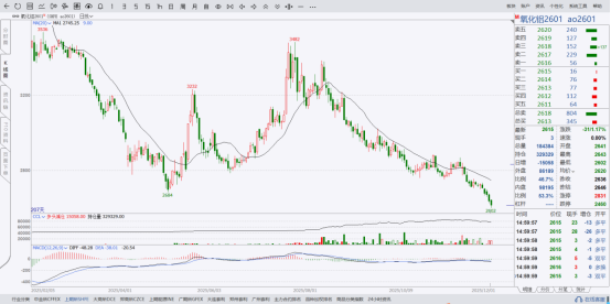 当日(1204),期货品种氧化铝ao2601合约下跌为主,开盘价2641元/吨,盘中最高触及2643元/吨,最低下探至元/吨,收盘价2615元/吨,较前一日结算价2646元/吨下跌1.17%,全日成交量为184384手,持仓量329329手。
