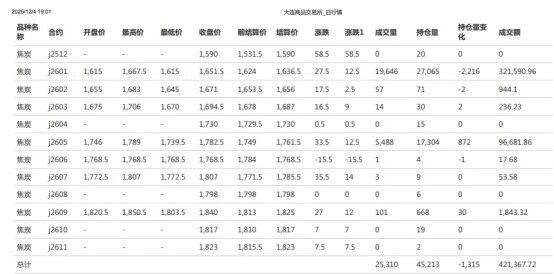 焦炭期货12个合约,价格呈现近弱远强的正向市场格局。全天除j2606合约下跌15.5点外,其他合约上涨,上涨幅度在0.5点到58.5点之间。品种持仓量45213手,较上一交易日减少1315手,其中焦炭j2601合约持仓量减少最多,减少2216手。