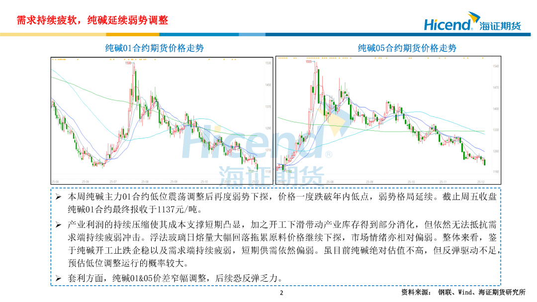 本周纯碱主力01合约低位震荡调整后再度弱势下探,价格一度跌破年内低点,弱势格局延续。截止周五收盘纯碱01合约最终报收于1137元/吨。
