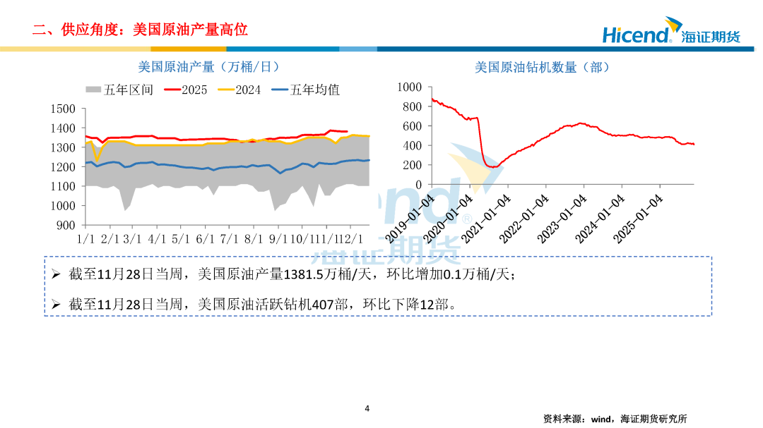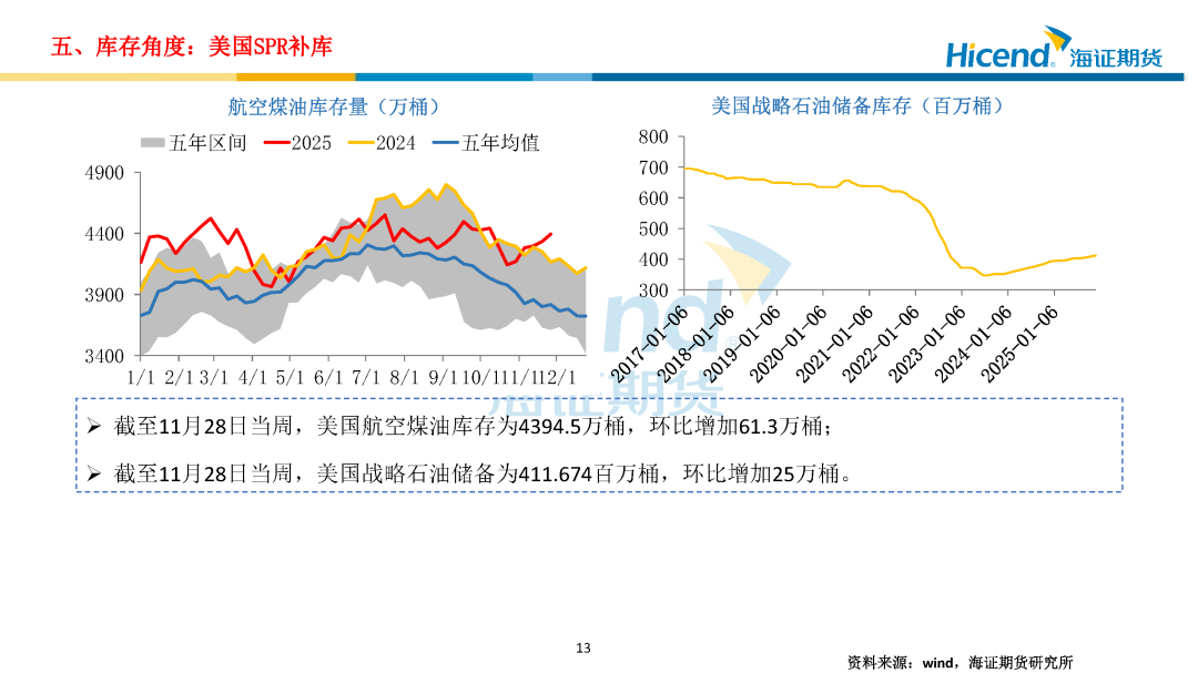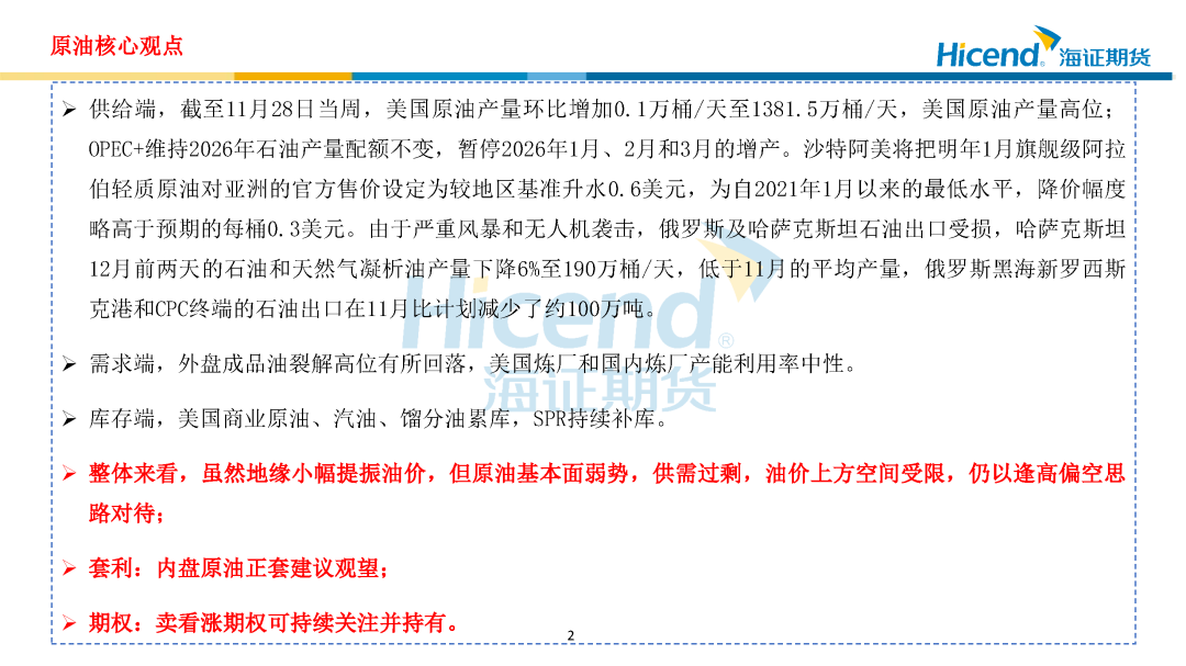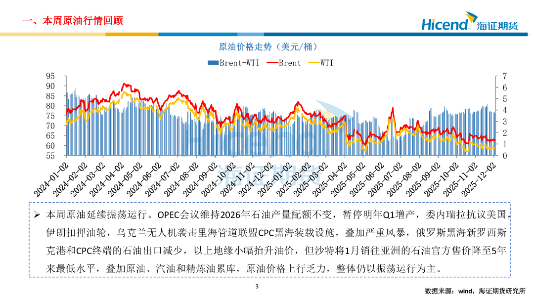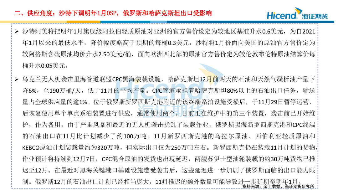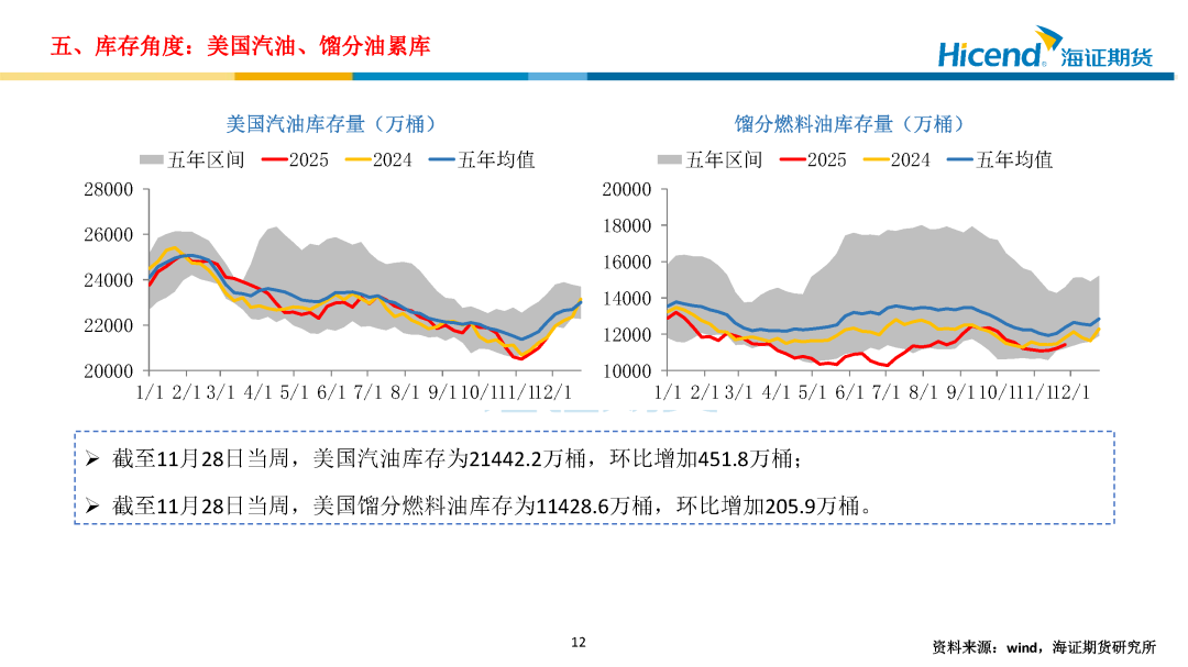 供给端,截至11月28日当周,美国原油产量环比增加0.1万桶/天至1381.5万桶/天,美国原油产量高位;OPEC+维持2026年石油产量配额不变,暂停2026年1月、2月和3月的增产。沙特阿美将把明年1月旗舰级阿拉伯轻质原油对亚洲的官方售价设定为较地区基准升水0.6美元,为自2021年1月以来的最低水平,降价幅度略高于预期的每桶0.3美元。由于严重风暴和无人机袭击,俄罗斯及哈萨克斯坦石油出口受损,哈萨克斯坦12月前两天的石油和天然气凝析油产量下降6%至190万桶/天,低于11月的平均产量,俄罗斯黑海新罗西斯克港和CPC终端的石油出口在11月比计划减少了约100万吨。