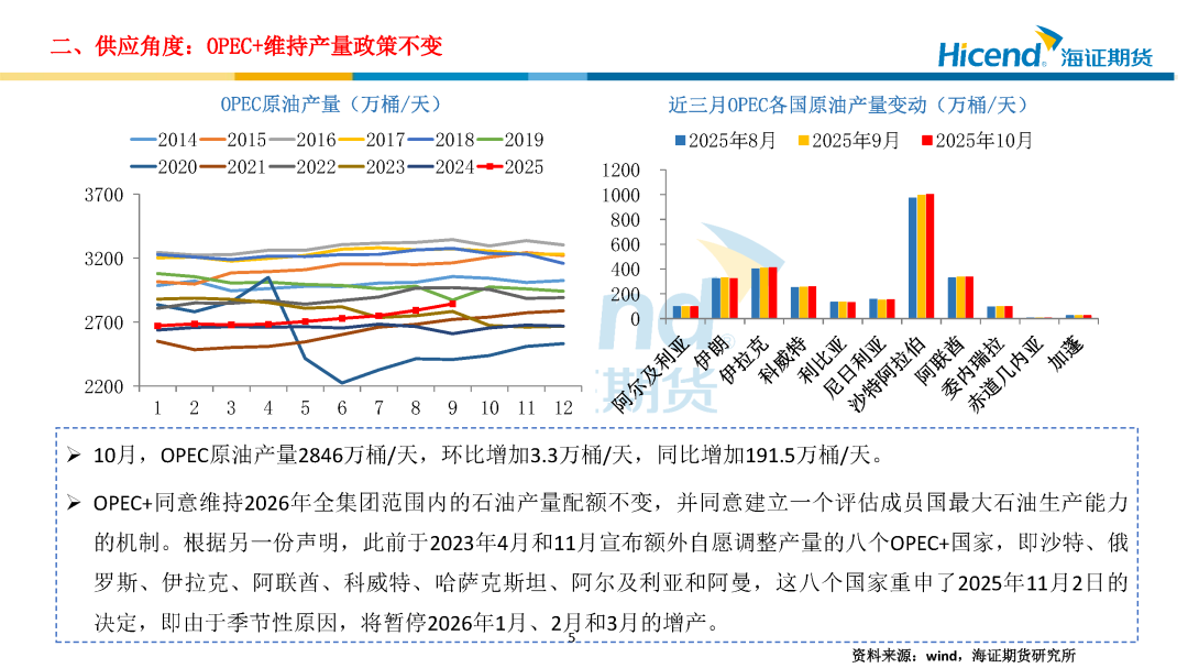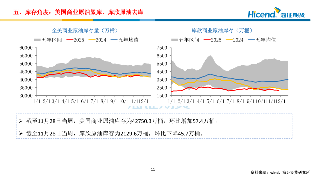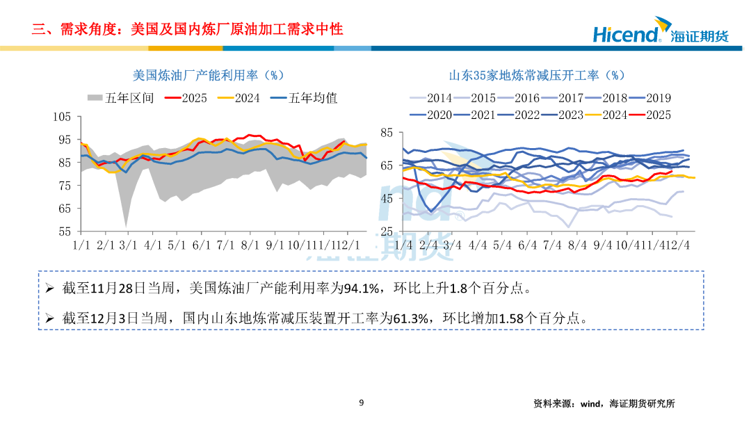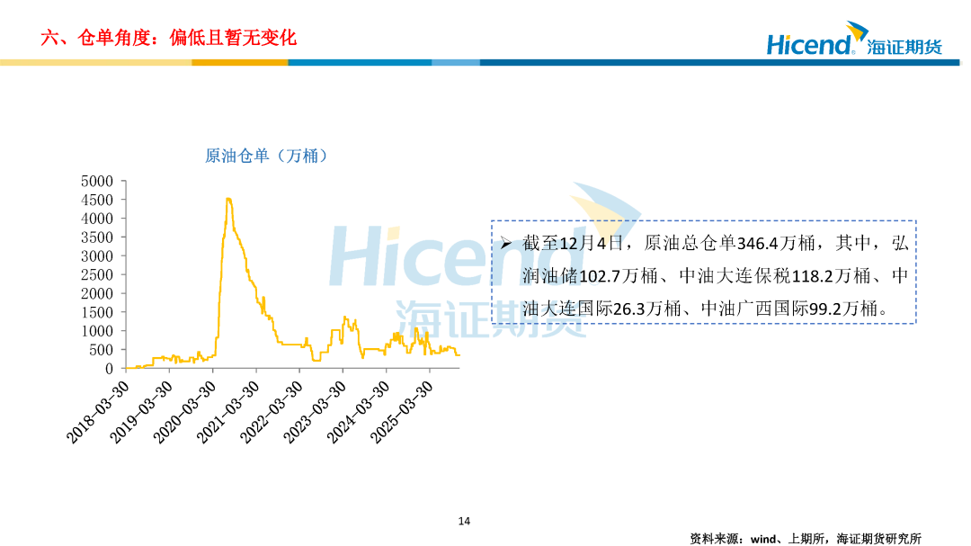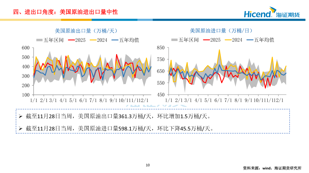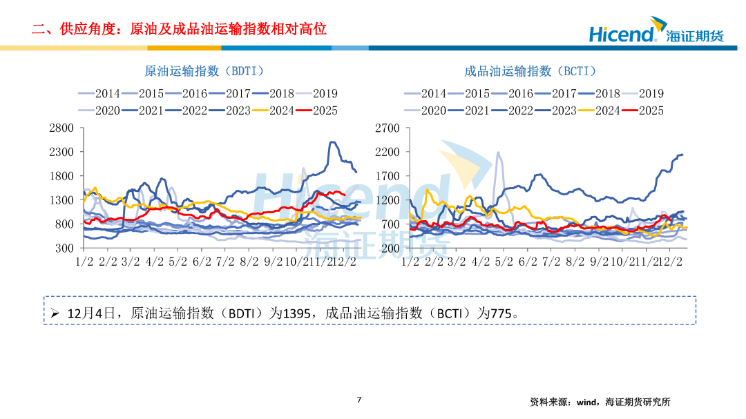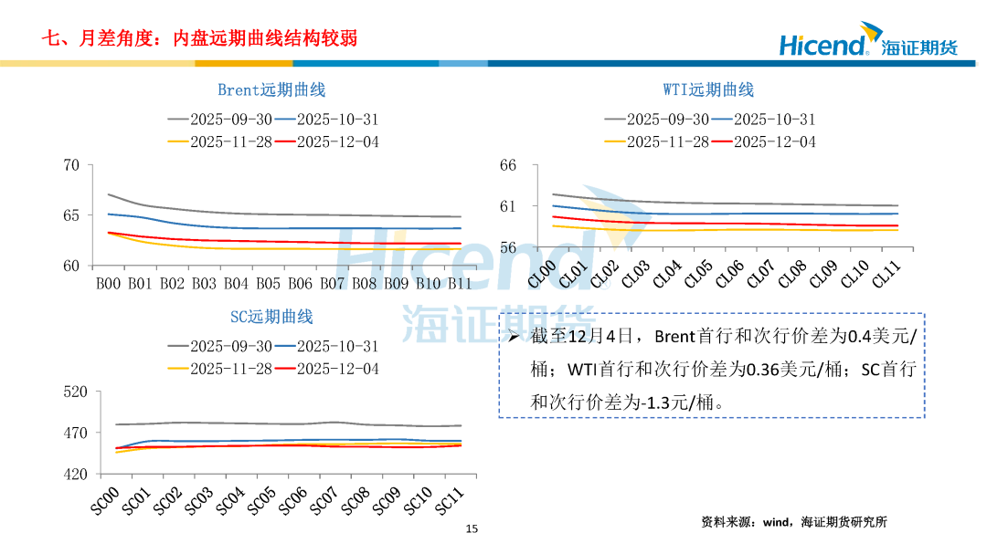 供给端,截至11月28日当周,美国原油产量环比增加0.1万桶/天至1381.5万桶/天,美国原油产量高位;OPEC+维持2026年石油产量配额不变,暂停2026年1月、2月和3月的增产。沙特阿美将把明年1月旗舰级阿拉伯轻质原油对亚洲的官方售价设定为较地区基准升水0.6美元,为自2021年1月以来的最低水平,降价幅度略高于预期的每桶0.3美元。由于严重风暴和无人机袭击,俄罗斯及哈萨克斯坦石油出口受损,哈萨克斯坦12月前两天的石油和天然气凝析油产量下降6%至190万桶/天,低于11月的平均产量,俄罗斯黑海新罗西斯克港和CPC终端的石油出口在11月比计划减少了约100万吨。