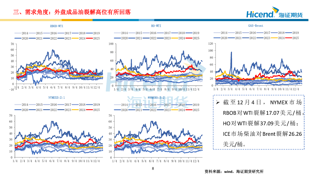 需求端,外盘成品油裂解高位有所回落,美国炼厂和国内炼厂产能利用率中性。