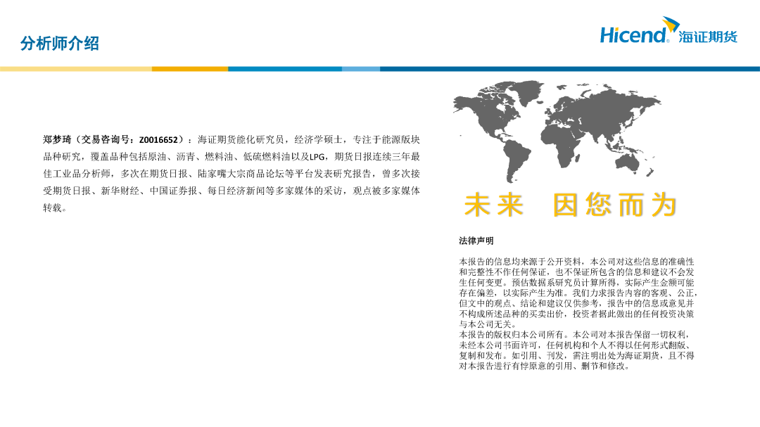 郑梦琦(交易咨询号:Z0016652):海证期货能化研究员,经济学硕士,专注于能源版块品种研究,覆盖品种包括原油、沥青、燃料油、低硫燃料油以及LPG,期货日报第十五届、第十六届最佳工业品分析师,多次在期货日报、陆家嘴大宗商品论坛等平台发表研究报告,曾多次接受期货日报、新华财经、中国证券报、每日经济新闻等多家媒体的采访,观点被多家媒体转载。