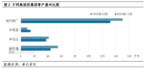 分集团所属来看,11月仅中海油沥青产量环比出现增加,其产量为14.5万吨,环比增加4.89万吨或50.88%,中海油泸州和营口检修结束后稳定生产,带动沥青产量环比增加。