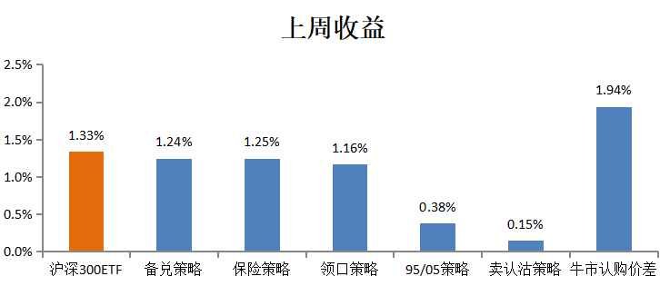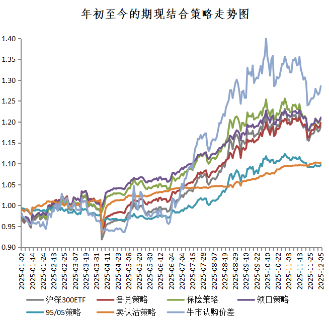 我们对期现结合的六个策略(备兑、保险、领口、95/05配置、卖认沽、牛市认购价差)及沪深300ETF现货,在上周(2025.12.1-2025.12.5)的表现进行了回测。上周沪深300ETF上涨,牛市认购价差策略表现较好。具体结果如下:
