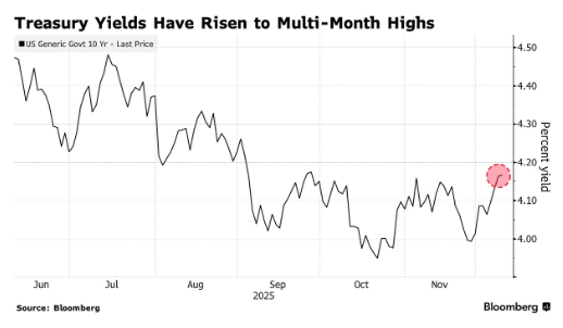 值得注意的是,美国10年期国债收益率较10月低点已攀升逾20个基点。而在美联储本周大概率再次降息25个基点的背景下,这一走势显得颇为反常。