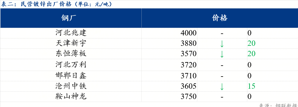 今日北方民营钢厂镀锌出厂指导价在3570-4000元/吨。