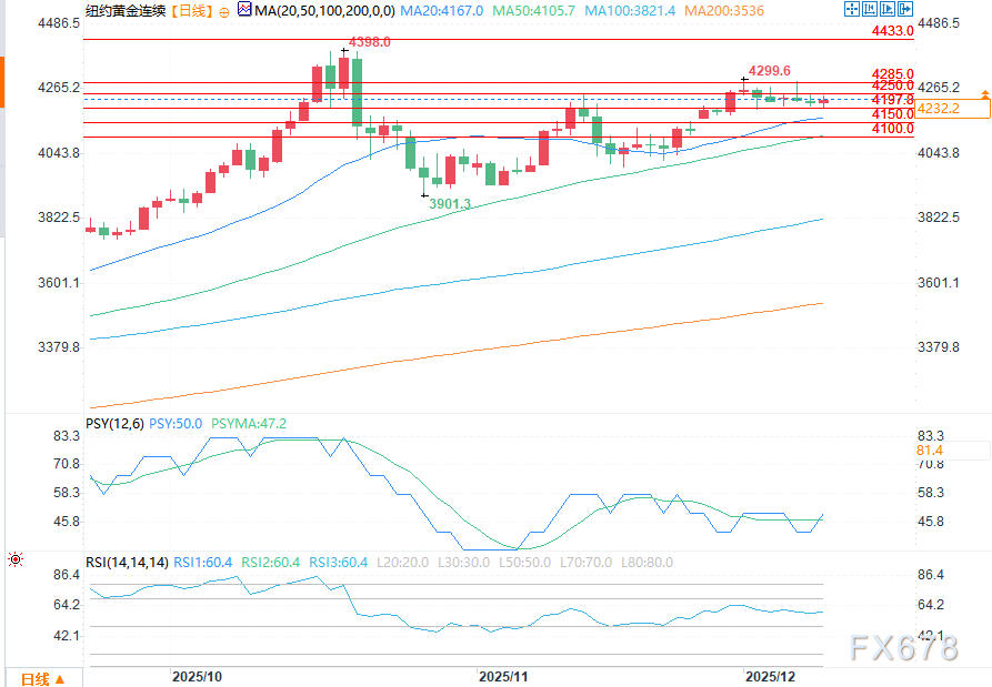 技术面来看,2月黄金期货多头的下一个上行目标是收盘价突破4433.00美元/盎司的合约高点(即历史高点)这一强劲阻力位。空头的近期下行目标是将期货价格推至4100.00美元/盎司的强劲技术支撑位下方。第一阻力位在4250.00美元/盎司,其次是4285.00美元/盎司;第一支撑位为隔夜低点4197.80美元/盎司,其次是4150.00美元/盎司。