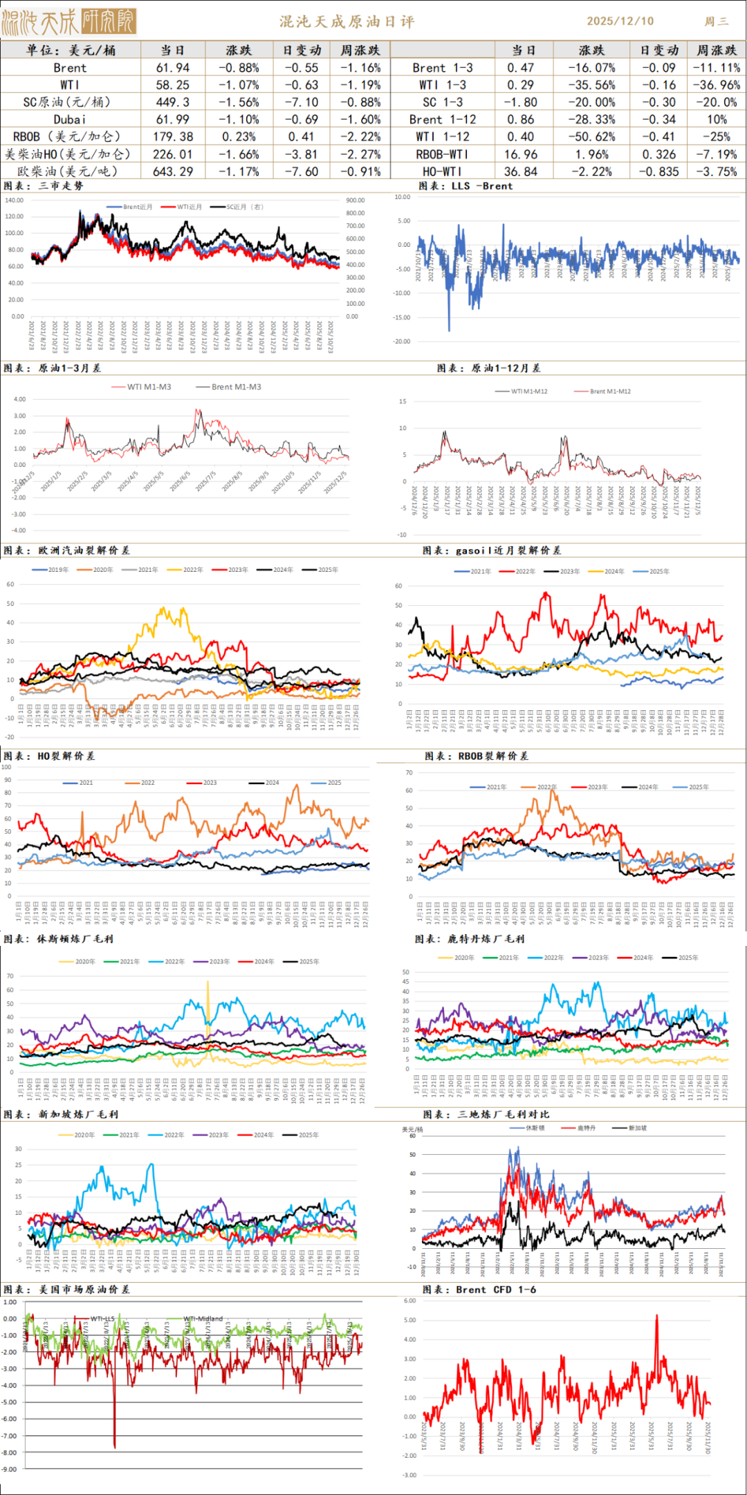 库存价差:截至12月5日,API原油库存下降478万桶,汽油库存上涨696万桶/日,馏分油库存上涨103万桶/日。
