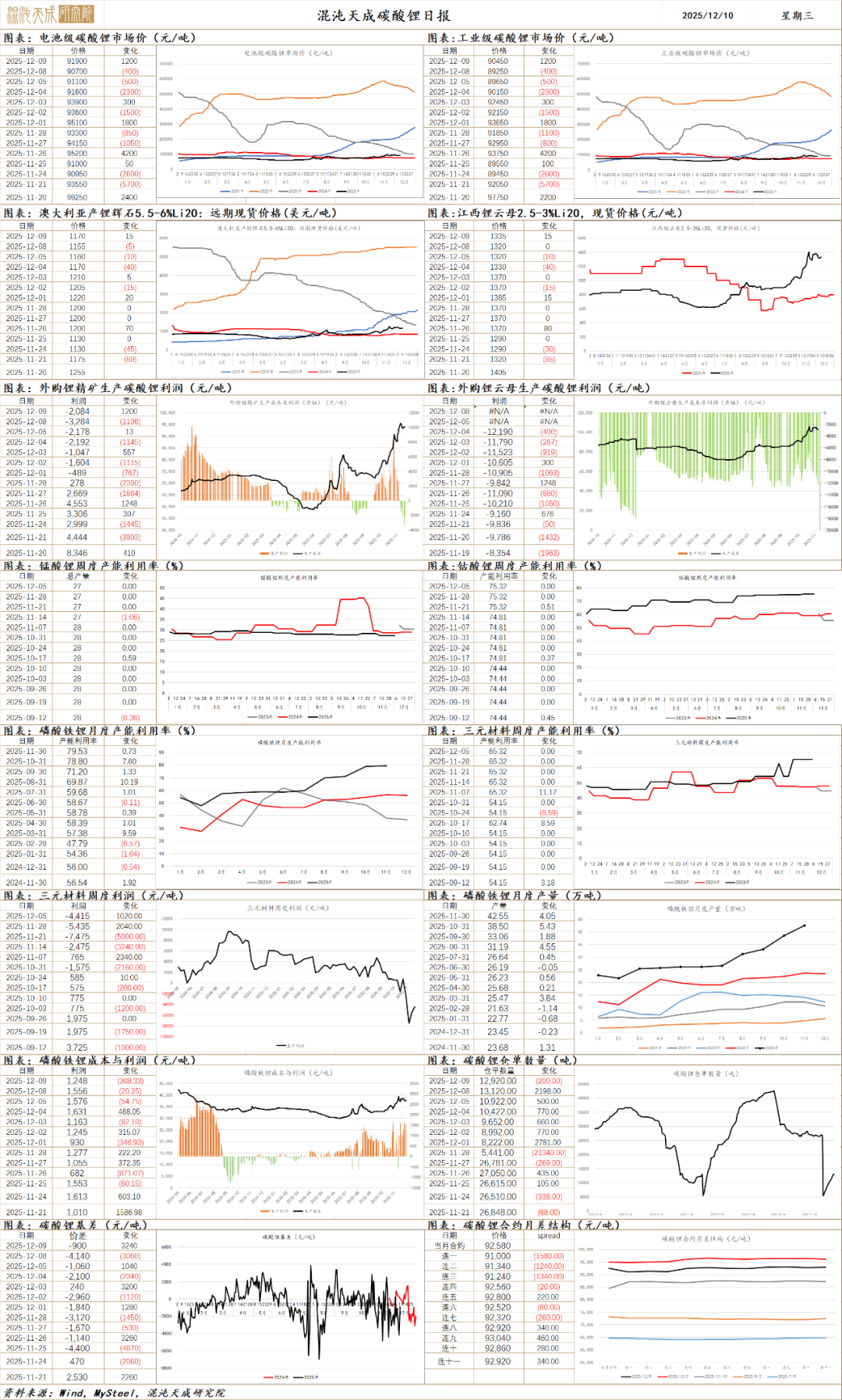 昨日碳酸锂主力合约收盘价92800元/吨,涨跌幅-1.23%。主力合约持仓-17708至575421手,仓单-200至12920吨。现货方面,电池级碳酸锂报价+1200至91900元/吨,工业级碳酸锂报价+1200至90450元/吨。锂精矿均价-5至1168美元/吨。