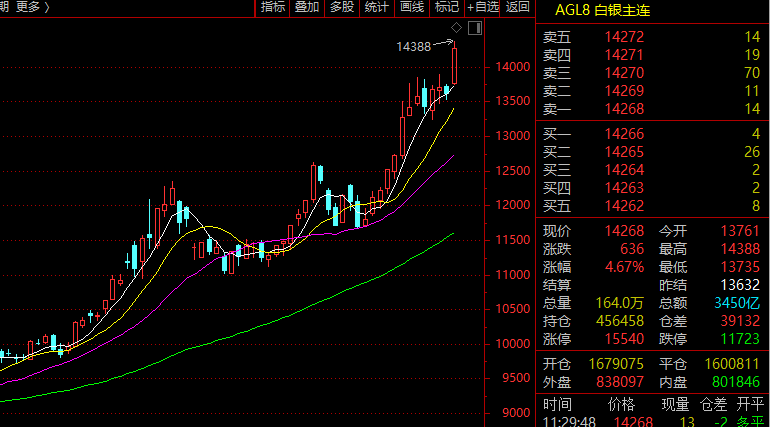 12月10日,国内期货市场沪银主力合约2602再度领涨,截至上午收盘报涨4.67%,盘中最高冲抵14388元/千克,刷新历史高点。