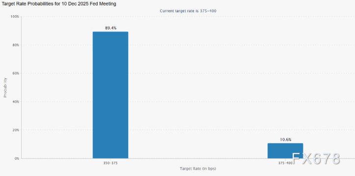根据CME FedWatch工具显示,联邦基金期货交易员预计降息25个基点的概率约为90%。