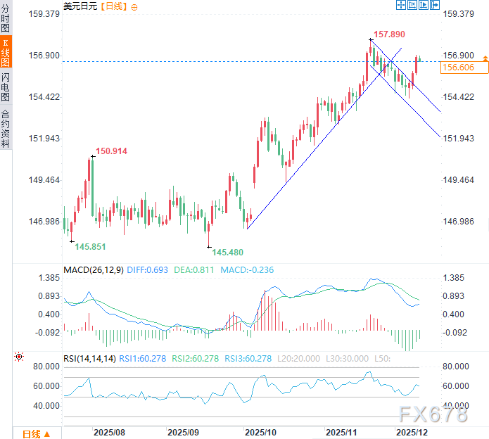 若美联储暗示将在今年第一季度保持观望立场,该货币对可能迅速延续涨势,测试上月高点158.00附近,甚至逼近年内高点159.00附近,这可能引发日本财务省在年底前出手干预。