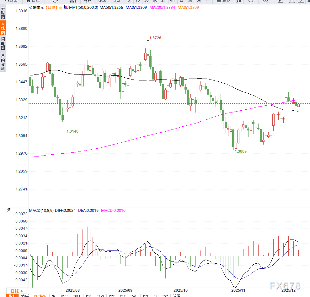 短期来看,GBP/USD在美联储鹰派降息与英央行潜在降息之间处于拉锯状态。从日线图来看,GBP/USD正处于1.3250–1.3350区间整理结构。价格在下方1.3250附近获得支撑,上方1.3350–1.3380区域形成压力带。