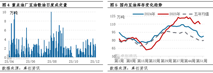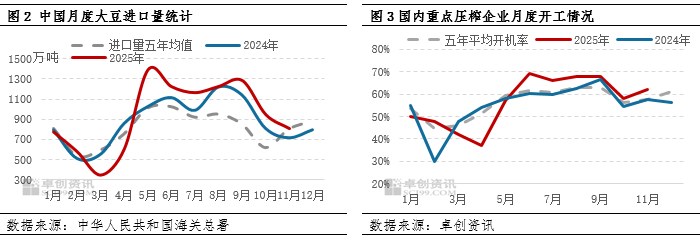 原料大豆月度进口量不断历史同期创新高,压榨企业开工平稳,令豆油产出持续宽松。根据中华人民共和国海关总署数据显示,2025年1-11月中国大豆进口量10378.9万吨,同比增幅6.9%;其中11月大豆进口量810.7万吨,同比增幅13.4%,达到2022年以来同期新高。因担忧四季度美豆供应缺口的出现,国内压榨企业继续加大南美大豆的进口。大豆原料的衔接令下半年以来的国内压榨企业开工维持偏高水平,豆油产出持续宽松。根据卓创资讯数据监测,11月中国重点压榨企业开工负荷率为62%,同比提升5个百分点,11月豆油产量161万吨,同比增长9.52%。