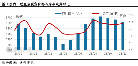 根据卓创资讯跟踪调研,12月大豆到港预估为864.5万吨,2026年1月大豆到港量预估650万吨,原料大豆到港季节性缩减将令国内压榨企业开工负荷率不稳定,豆油产出有收紧预期,基本面对行情支撑力度转强。但由于当前库存处多年来高位水平,且需求未见明显增量预期下,豆油库存降幅或仍偏慢,高位库存难以较快消化将会制约年底前豆油现货价格涨幅。因此预计春节前国内豆油现货价格或窄幅偏强,一级豆油现货价格运行区间8300-8600元/吨。